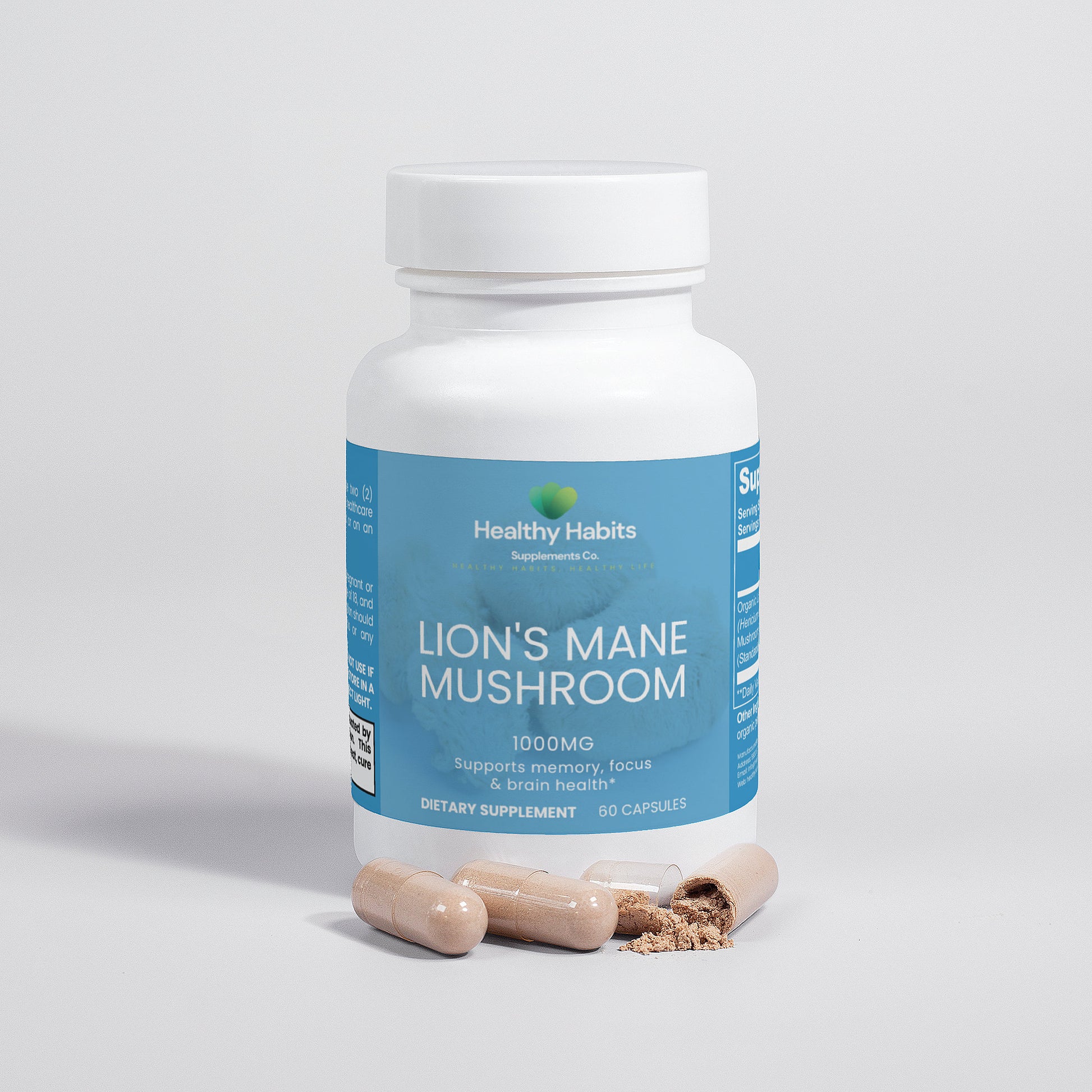 Ingredients: Organic Lion’s Mane (Hericum erinaceus) Mushroom Fruiting Body & Mycelium Powder (Standardized to 40% polysaccharides [400mg]), Vegan Capsule (modified cellulose, water).
